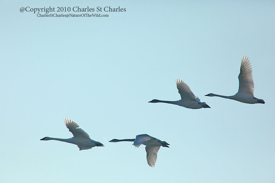 I've come to photograph Trumpeter Swans that are wintering on the open water. They are the largest waterfowl in the world, and one of the rarest birds. My timing has been good and in the predawn light I photograph passing swans. I pan with the birds in flight, making motion blurs - images that sing the praise of feathers in flight.