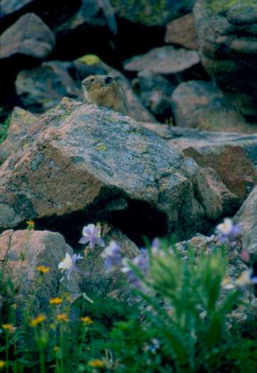 If you find yourself above the tree line in the summer and hear the whistle of the "rock rabbit" stop for a little while and watch these little busy bodies. They will often hide in the talus when you first appproach, but pretty soon they will emerge from their burrows. Once they become used to your presence they will resume their normal activities. Watching them collocting food, sunning themselves, chasing each other around and whistling at each other will be sure to entertain you. You'll be glad that took the time to visit the rarely seen Pika.